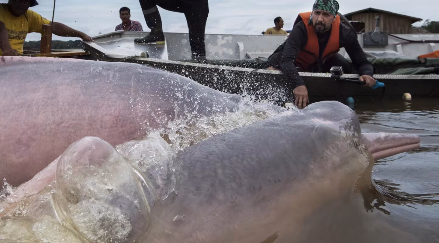 Jaguar, loutre géante, ara, dauphin rose de l’Amazone, singe-araignée ou “attelle”, dendrobatidé (grenouilles venimeuses), anaconda, piranha, iguane