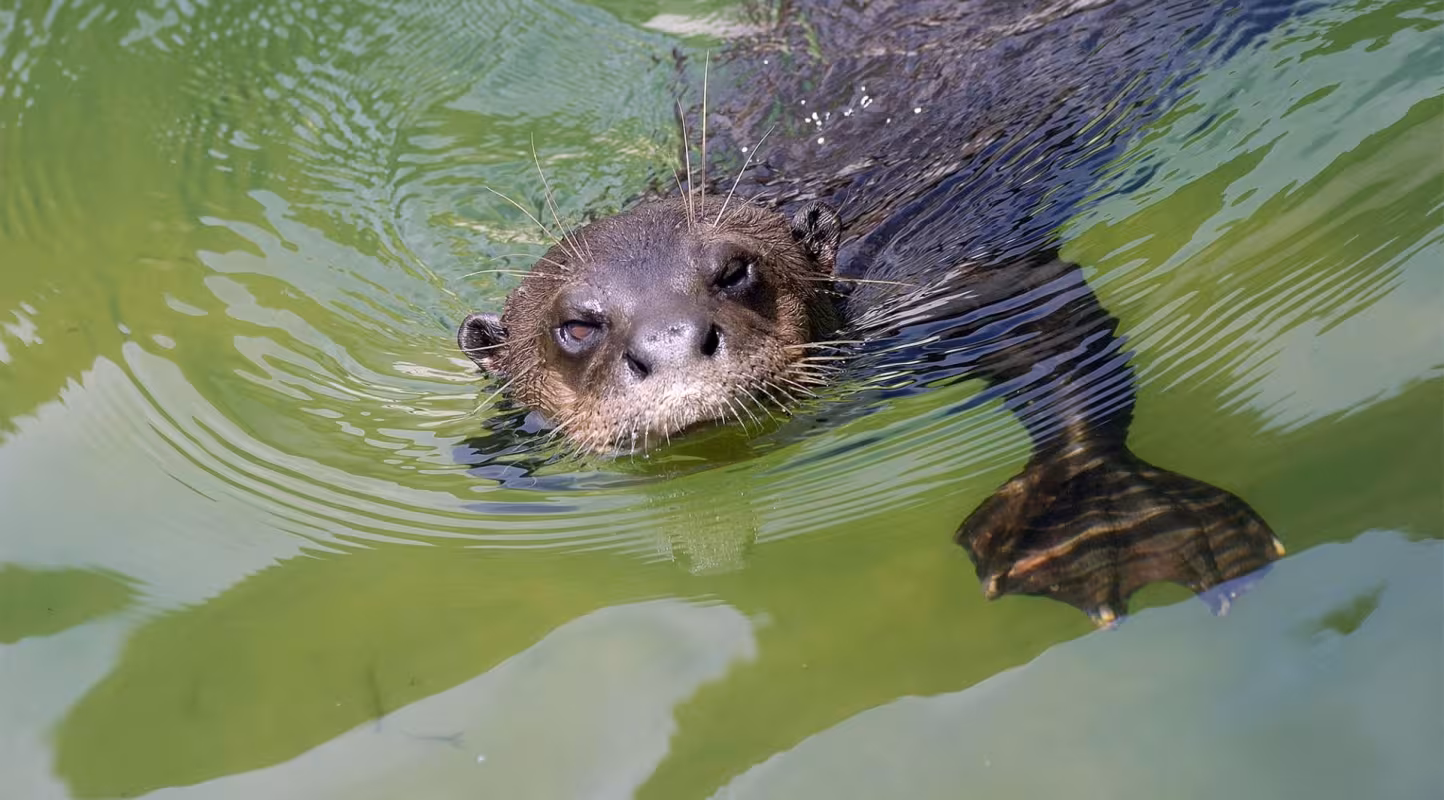 Parmi les 13 espèces de loutres présentes dans le monde, la loutre géante est la plus imposante. Outre sa taille, on la reconnaît facilement à sa gorge parsemée de tâches claires. Sa queue longue et aplatie est un gage de puissance pour la nage en eau vive.