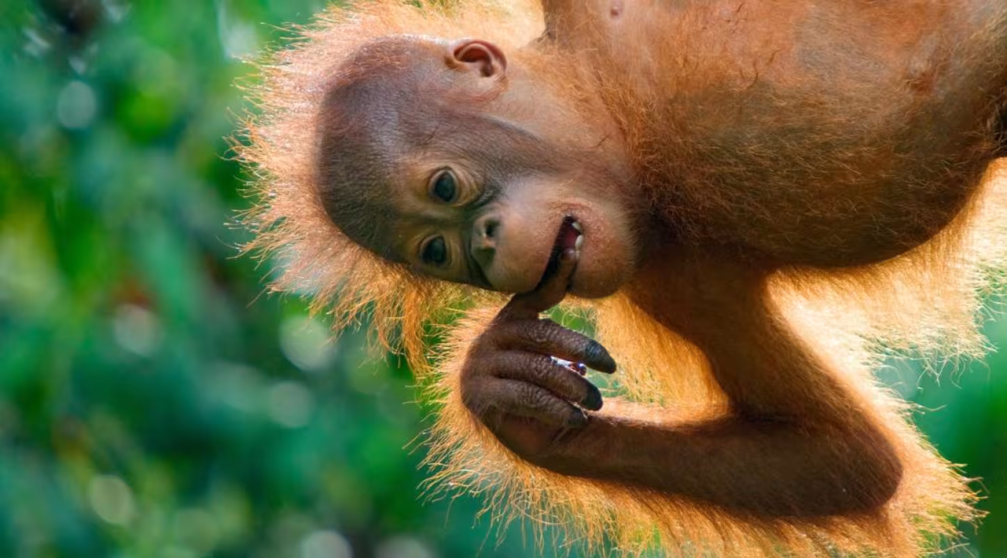Le nom « orang-outan » vient du malais orang hutan, qui signifie littéralement « homme de la forêt ». Ce grand singe a élu domicile à la cime des arbres et parcourt inlassablement la canopée à la recherche de fruits, de feuilles et d’insectes.